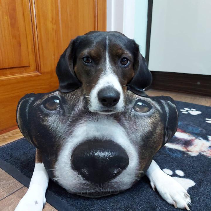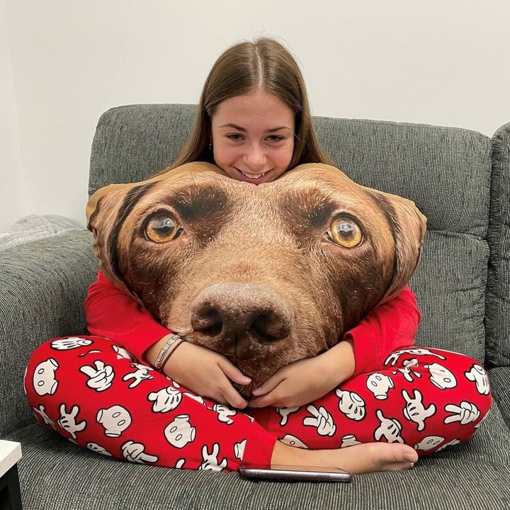 Transform your dog into a hilarious, huggable face pillow. Our mega cushion is a full-sized face cushion perfect for your pet or you to cuddle up to!