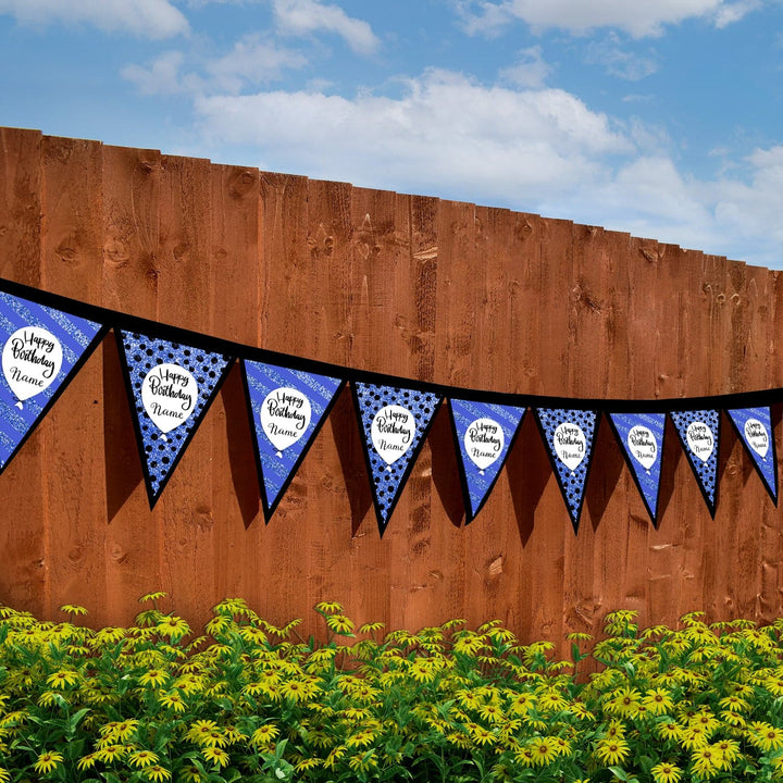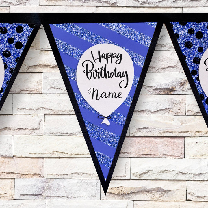 Personalised Birthday Blue Printed Glitter - 3m Fabric Photo Bunting With 15 Individual Triangles
