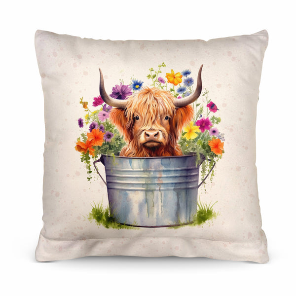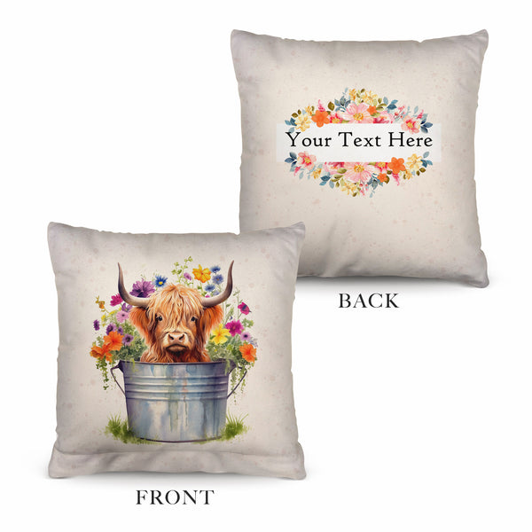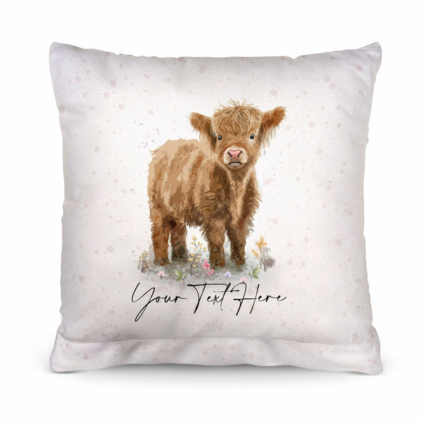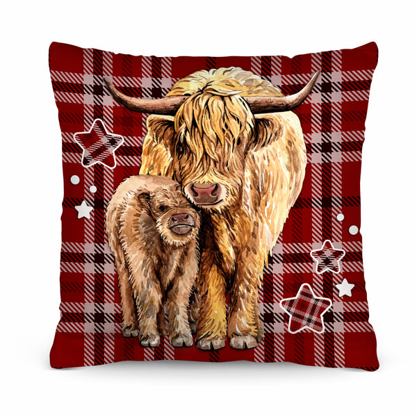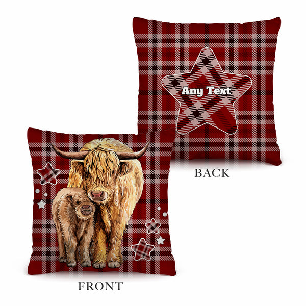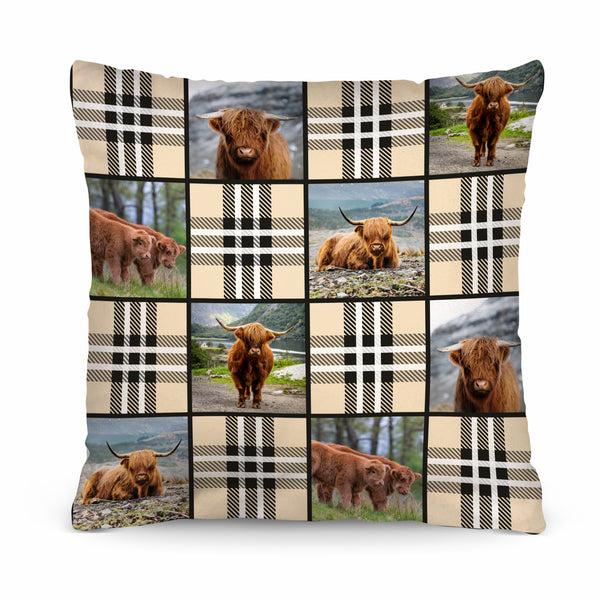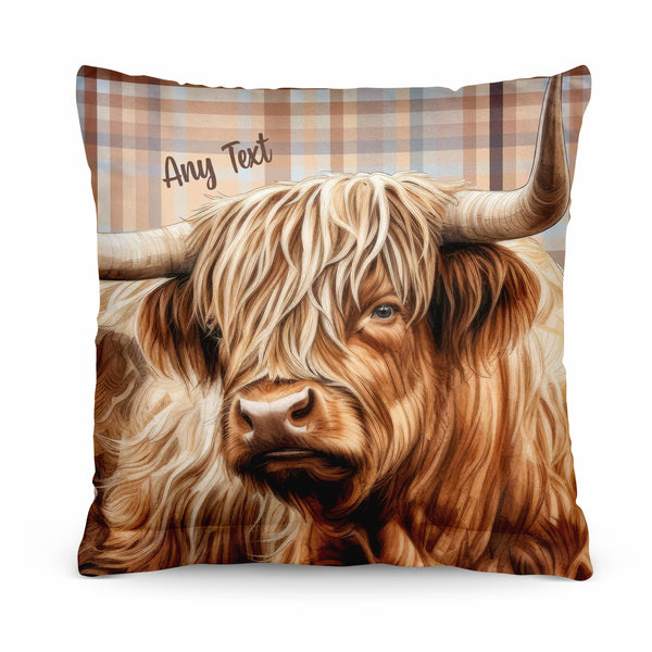 Highland Cow - Beige Tartan - 26cm x 26cm - Personalised Cushion