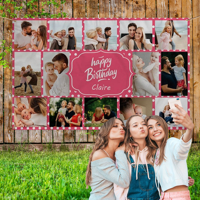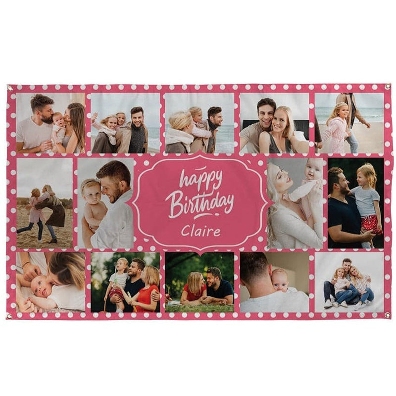 This Happy Birthday personalised photo banner is a great addition to your upcoming birthday party, celebration, or any other occasion! Edit the text in the centre to reflect your occasion or share a personal message and add 14 of your most cherished photos.