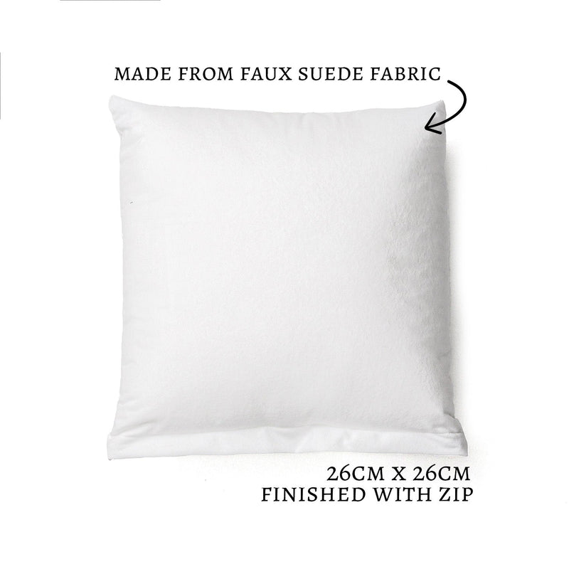 This cushion is a standard size of 26cm x 26cm and comes stuffed with a comfy inner that is manufactured by us in-house.