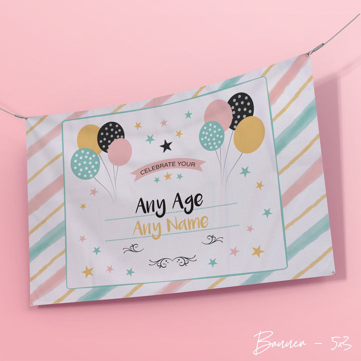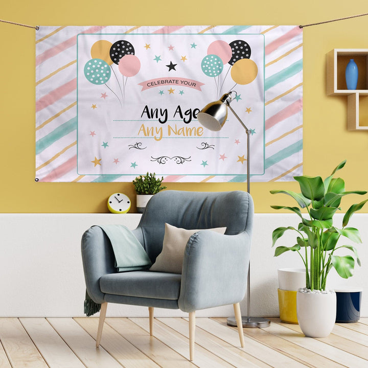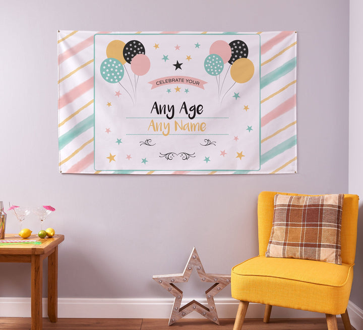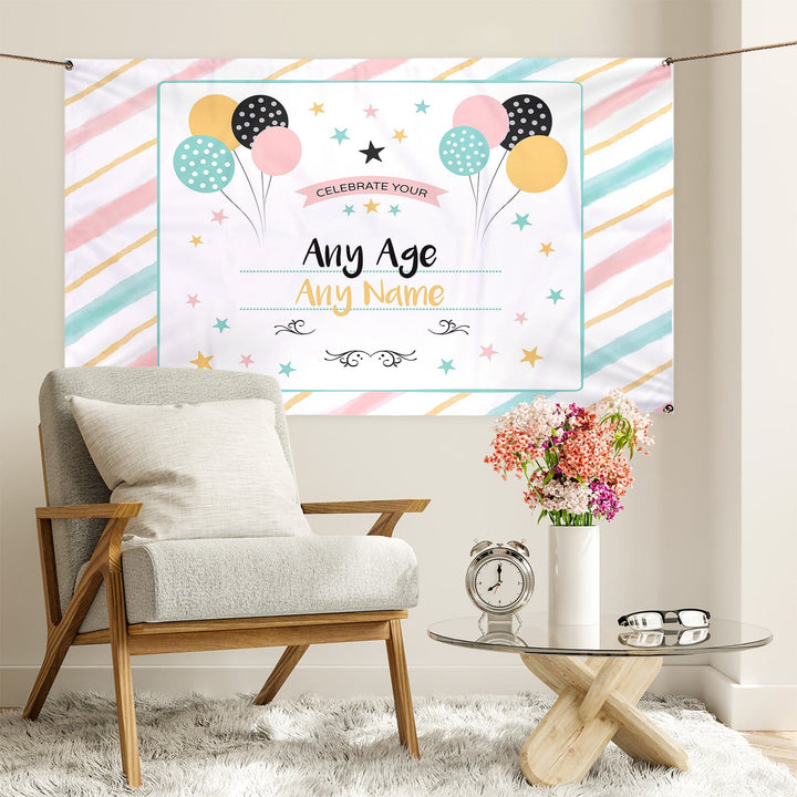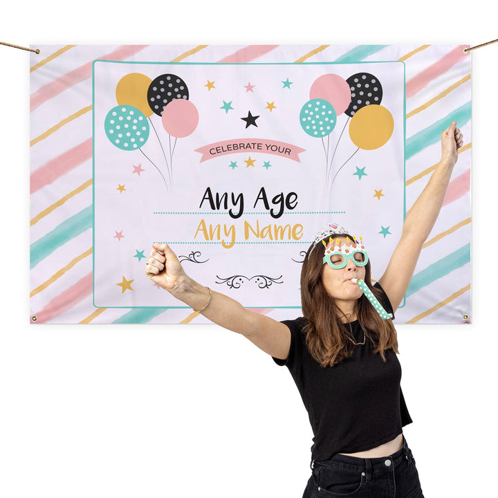Personalised Stripey Birthday Party Name & Age Banner - 5ft x 3ft