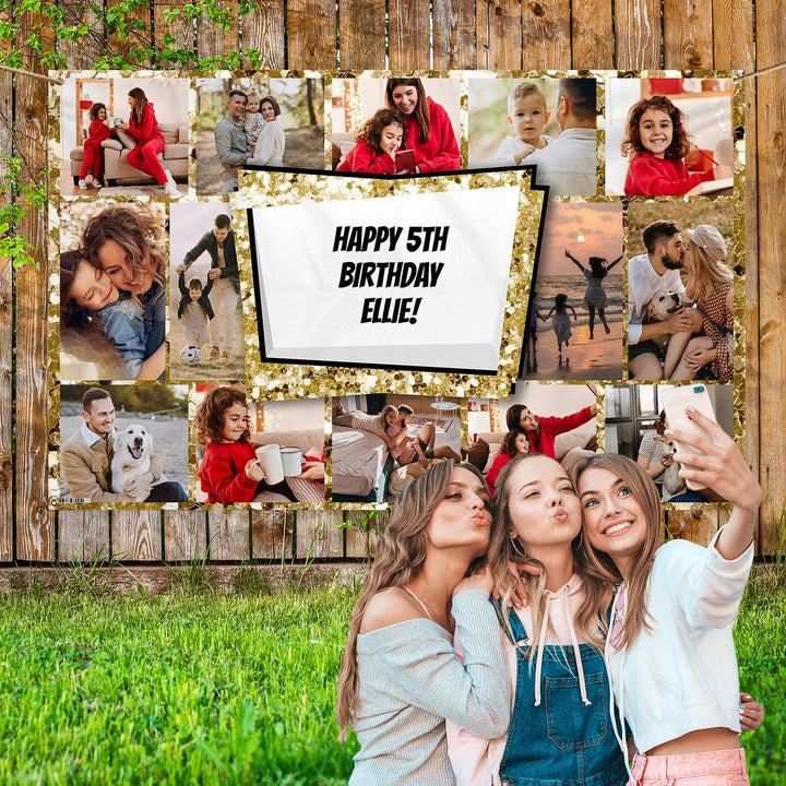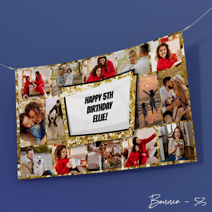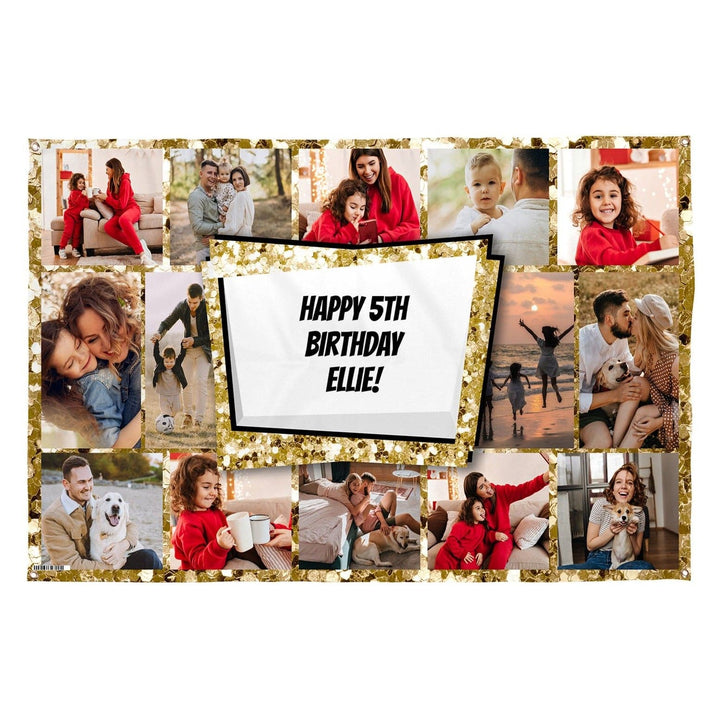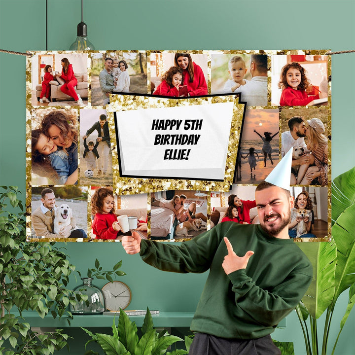 This personalised gold glitter photo banner is a great addition to your upcoming event! Suitable for any occasion, you can edit the text to reflect your celebration or share a personal message and add your most cherished photos.