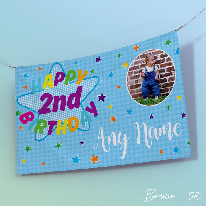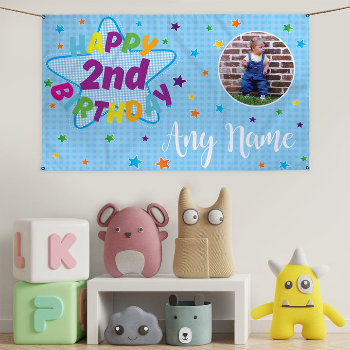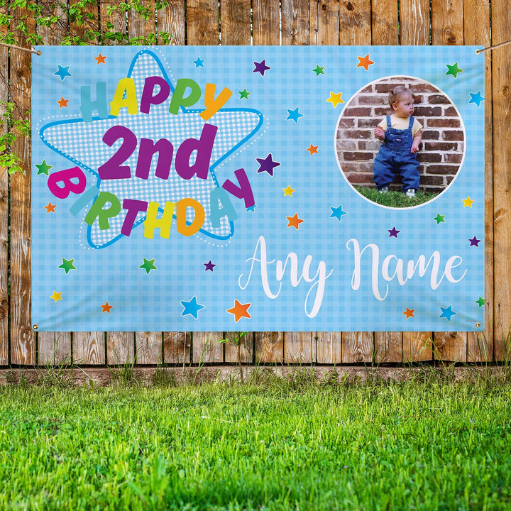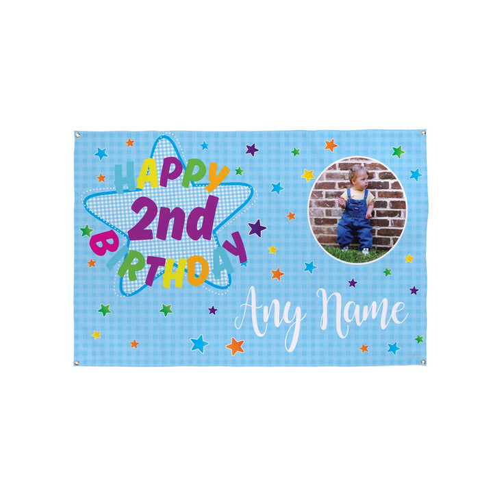 Kids Blue Stars Happy Birthday Fabric Banner - Add Photo Edit Age - 5ft x 3ft