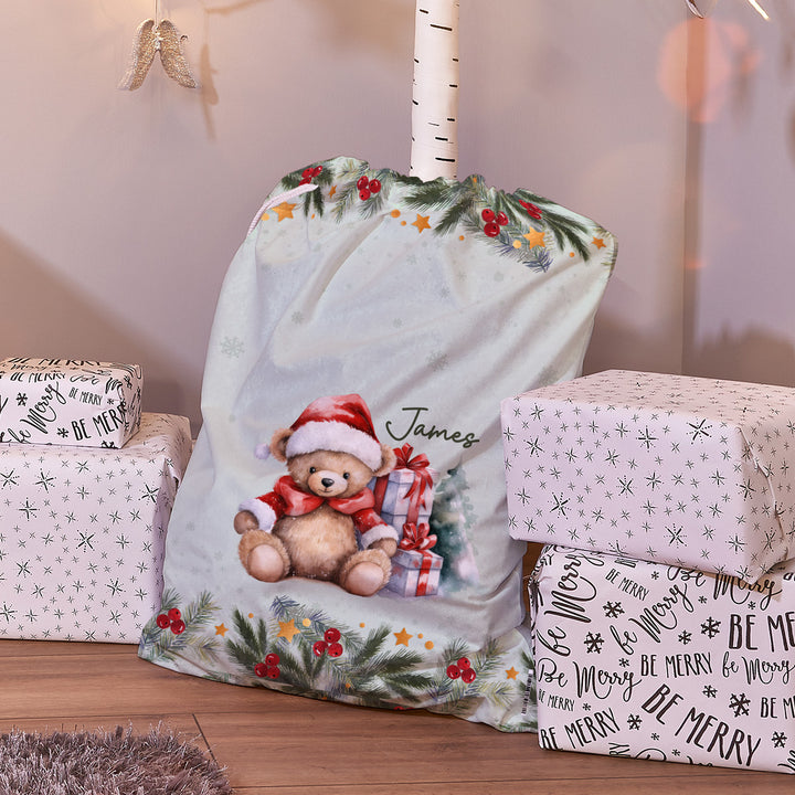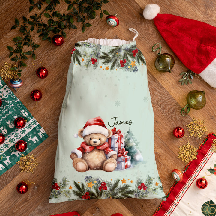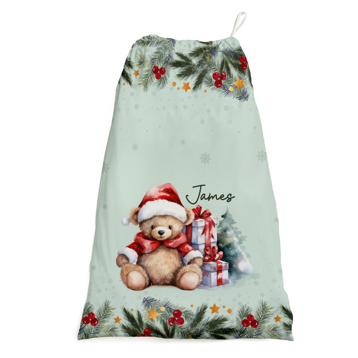 Christmas Bear - Green Holly - Personalised Santa Sack