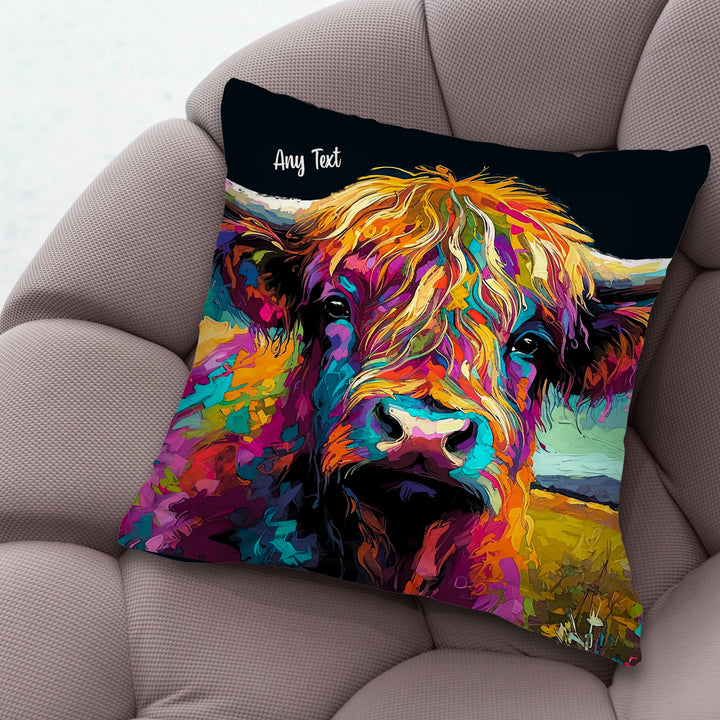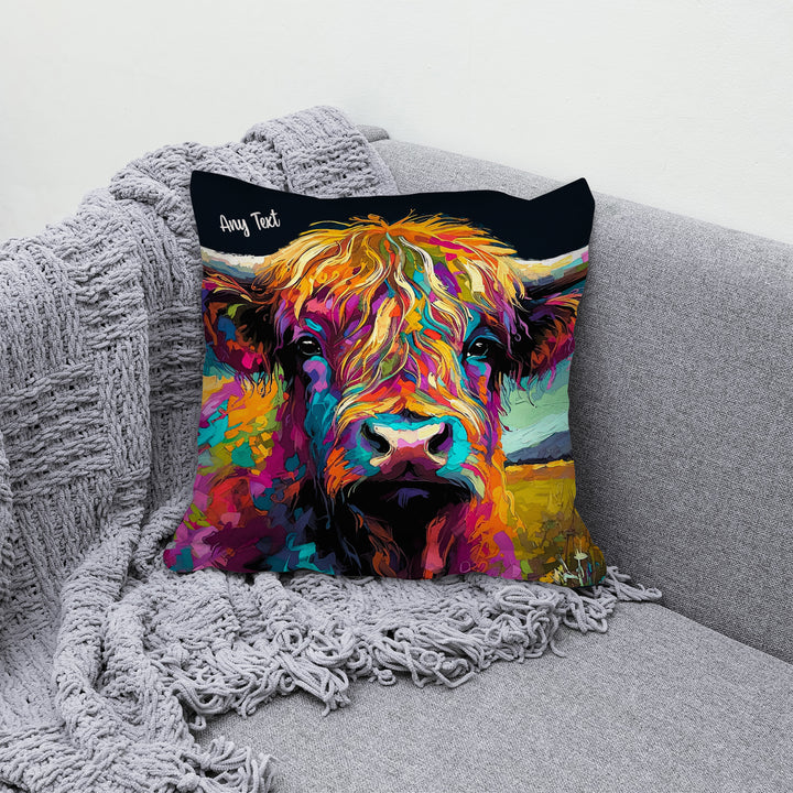 Highland Cow - Bright Colours - Dark Navy Base - 26cm x 26cm - Personalised Cushion