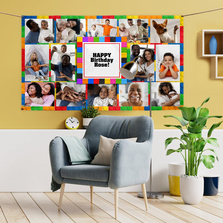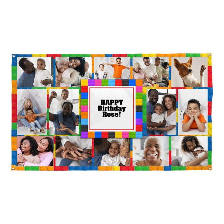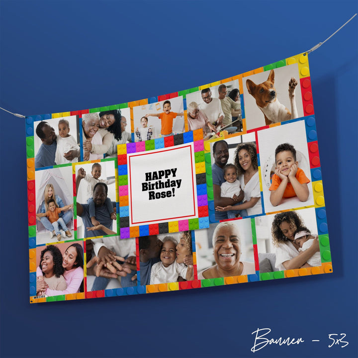 This personalised kids lego photo banner is a great addition to your upcoming Children's birthday party! You can edit the text to reflect your celebration or share a personal message and add 14 photos of your little one to celebrate their birthday.