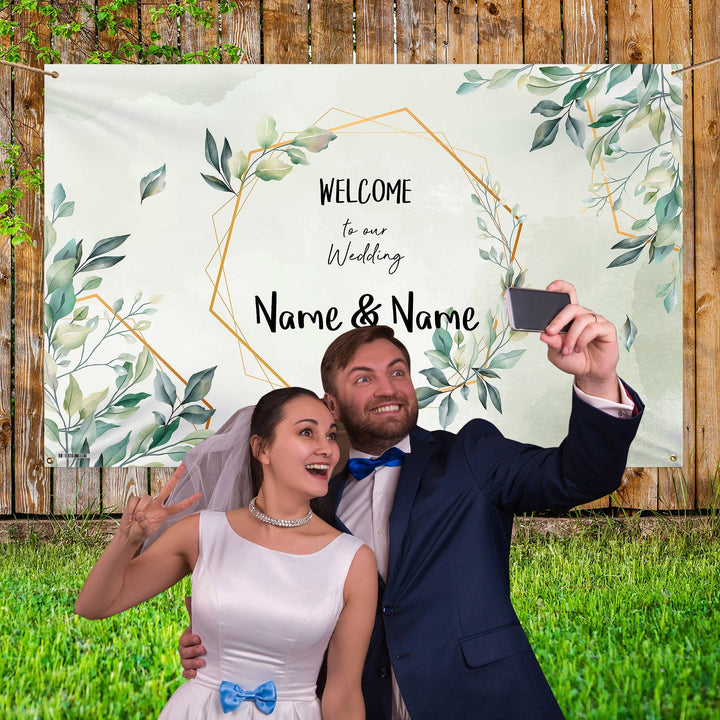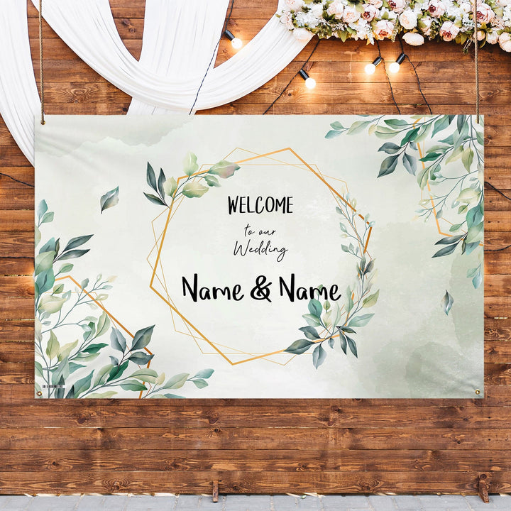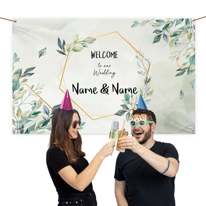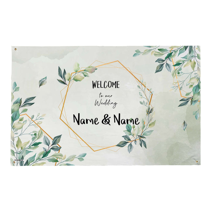 Personalised Fabric Photo Banner 5ft x 3ft - Wedding Welcome - Green Leaves