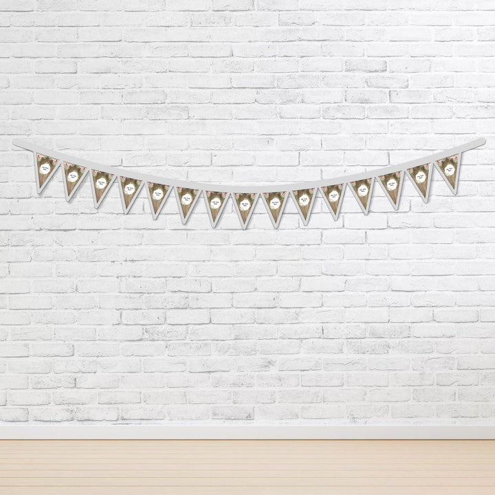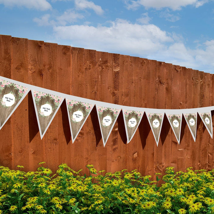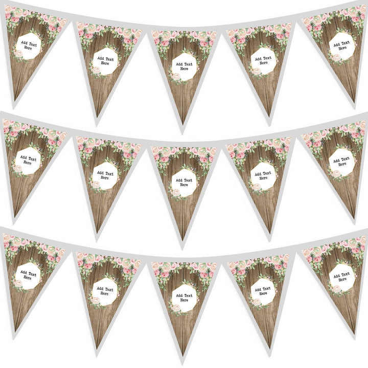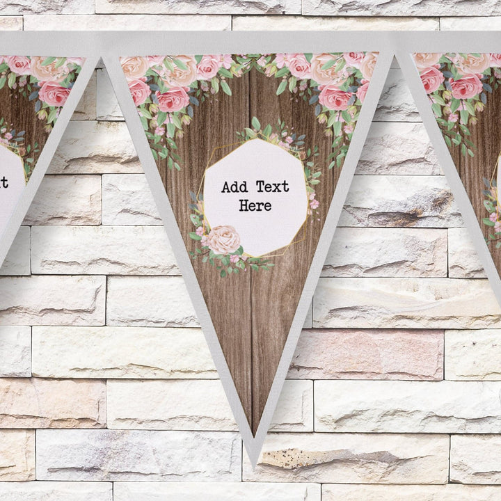 Our personalised Blush floral wood print fabric bunting makes a great addition to any venue, from birthday, wedding, baby shower or garden party.