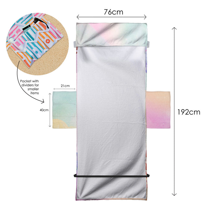 Our sun lounger towel is generously sized to fit most standard sun loungers perfectly. With dimensions of 192cm x 76cm, plus an additional 25cm in length that folds over the top of your lounger to keep it in place. Each towel is designed with two convenient side pockets to meet your storage needs.