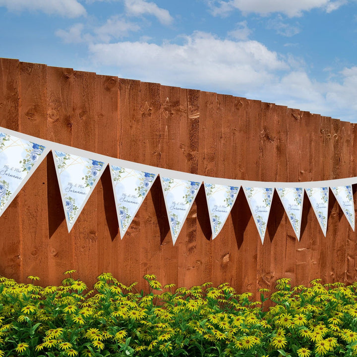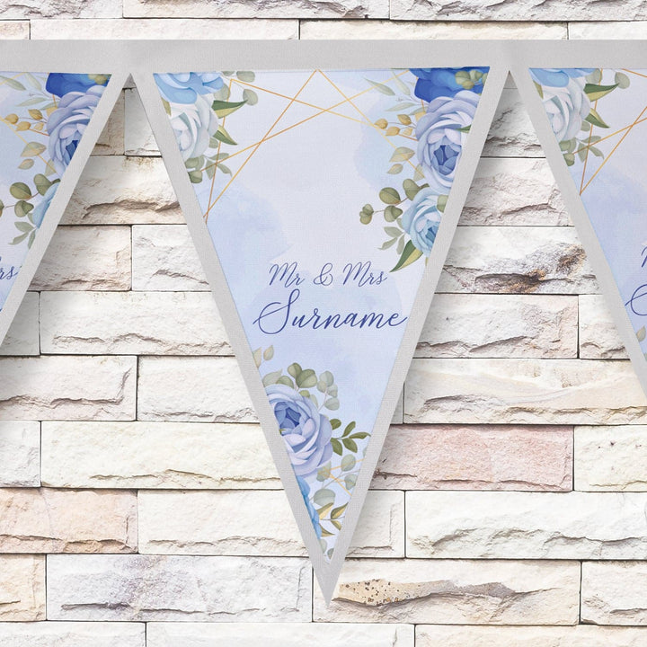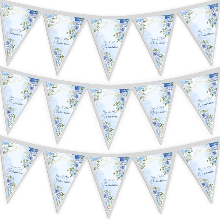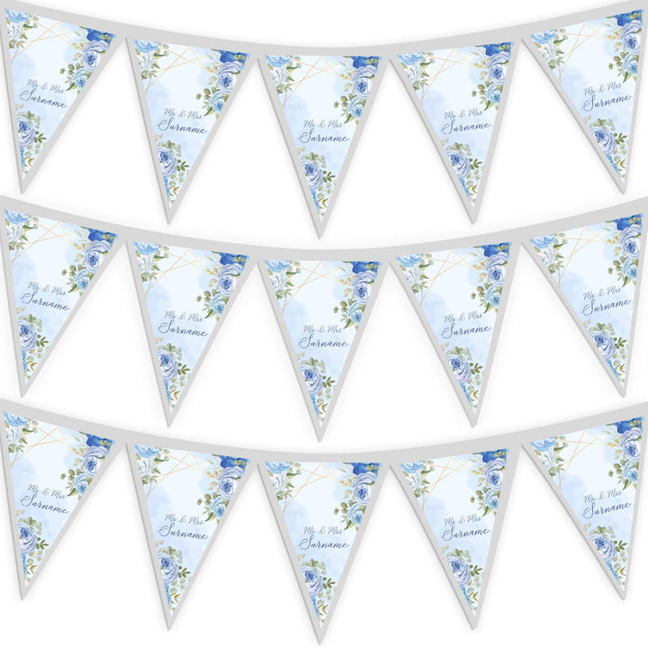 Personalised Wedding - Blue Roses - 3m Fabric Bunting With 15 Individual Triangles