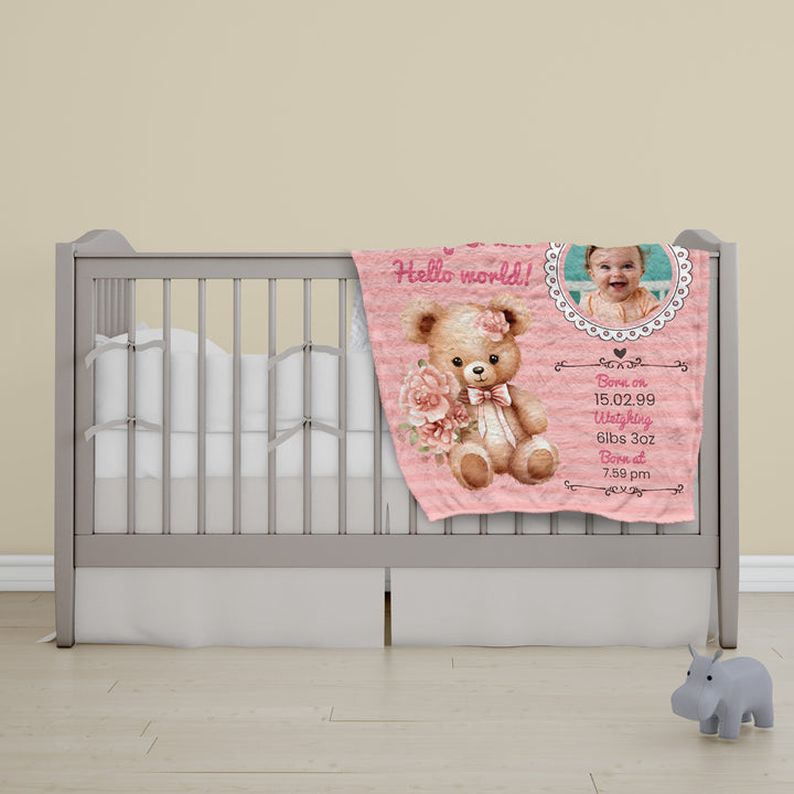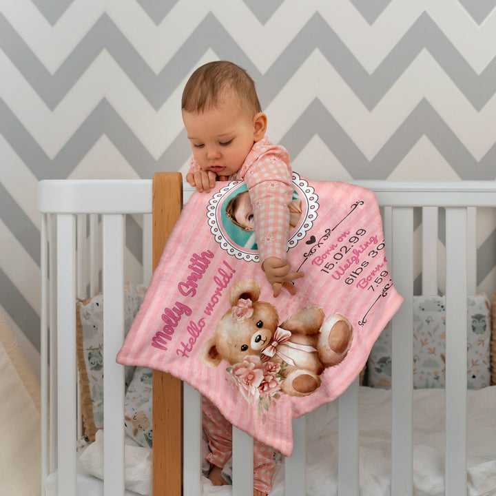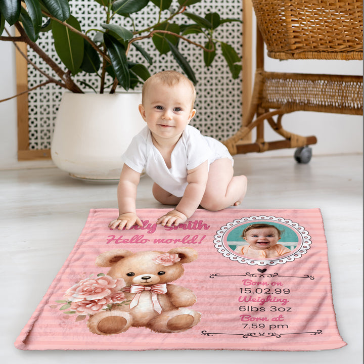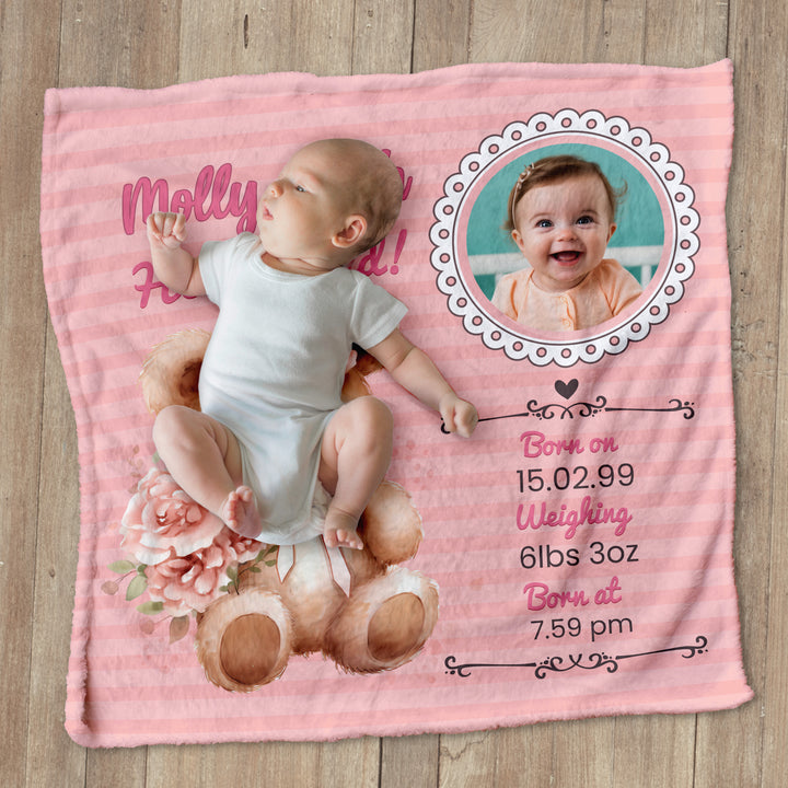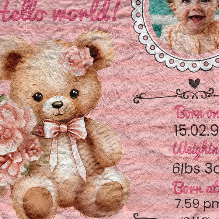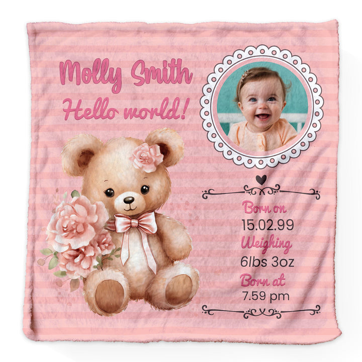 Pink Bear Baby Information - Personalised Extra Soft Luxury Baby Blanket - 75cm x 75cm
