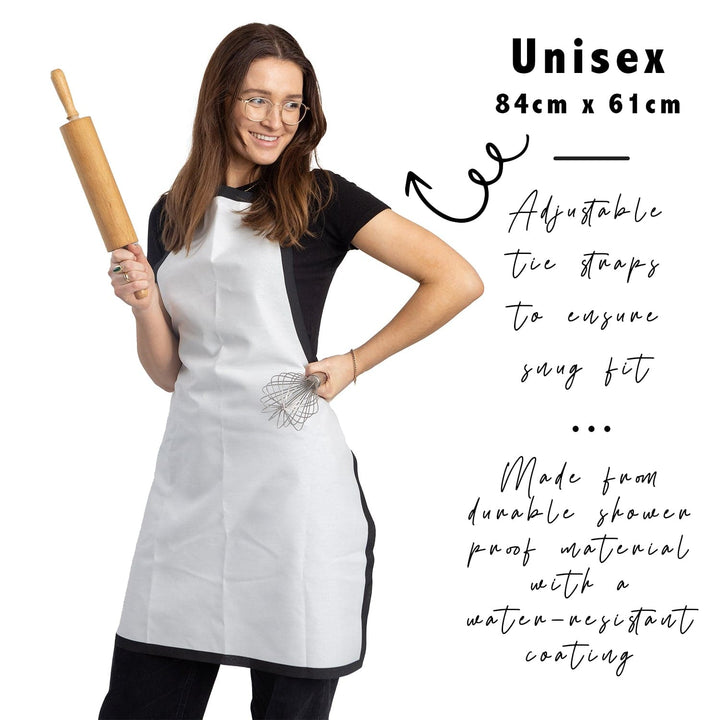 Our personalised aprons are perfect for arts, crafts, decorating, cooking, baking and BBQ’s. At a generous size of approximately 84cm x 61cm, the custom aprons come as one size fits all and are suitable for both males and females.