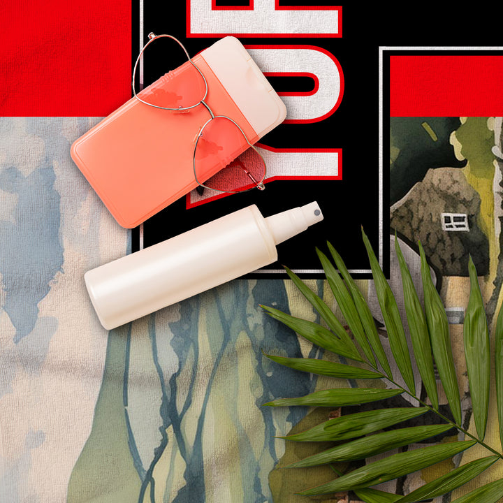 Our custom beach towels are handcrafted here in the UK using 300gsm microfibre towelling, which is lighter and more absorbent than cotton towels.